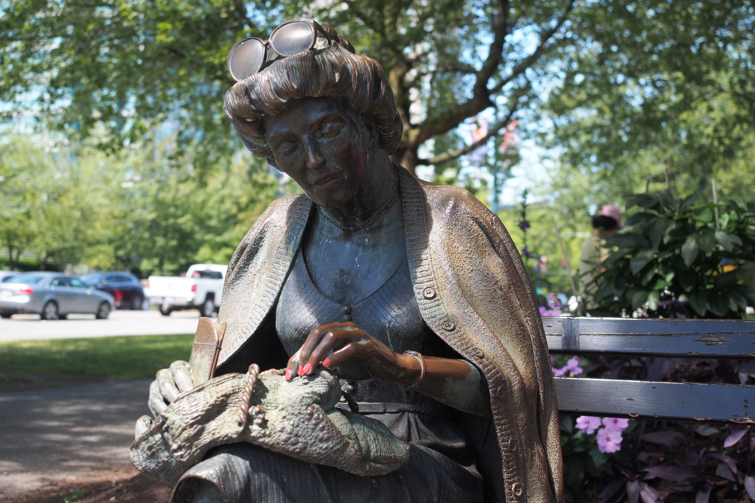 The Lady on the Bench is a bronze statue Stanley Park, Vancouver’s largest urban park. Also known as “Search”, or as the local call her, “Flower Lady”, for the flowers locals sometimes leave on her bag.
